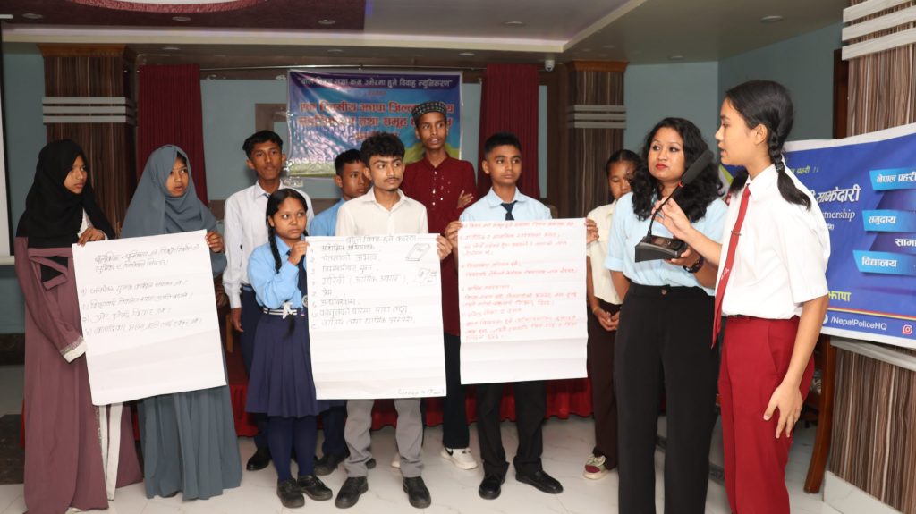 Key facilitation and discussions were led by Mr. Suman Adhikari, Provincial Coordinator for Child Search and Rescue; Advocate Ms. Kabita Pathak, Member of the Nepal Bar Association Jhapa; and Police Inspector Mr. Prabin Shrestha.