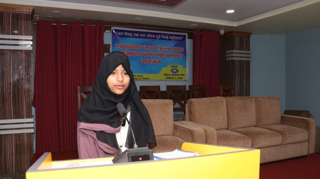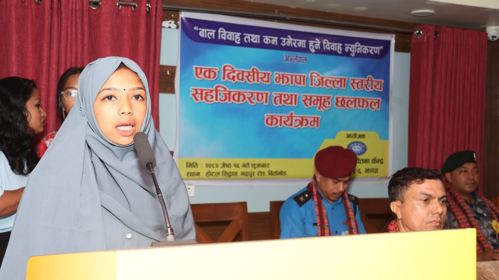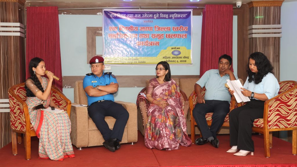 Under the initiative led by Mahila Janachetana Kendra to reduce child marriage, a one-day district-level facilitation and group discussion program was successfully organized at Siddhartha Hotel, Birtamod, Jhapa.